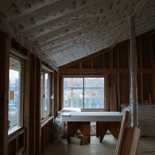 <豊郷台のすまい>の現場ではすっかりお馴染み、定点撮影のアングル・・・作業は慣れた大工職による屋根断熱材の充填中。 今日の空の色は鉛色で窓から見える景色は寒い冬。 GRⅢ ノートリミング EV-0.3 午後から瑕疵担保保険加入のための現場検査ということ…