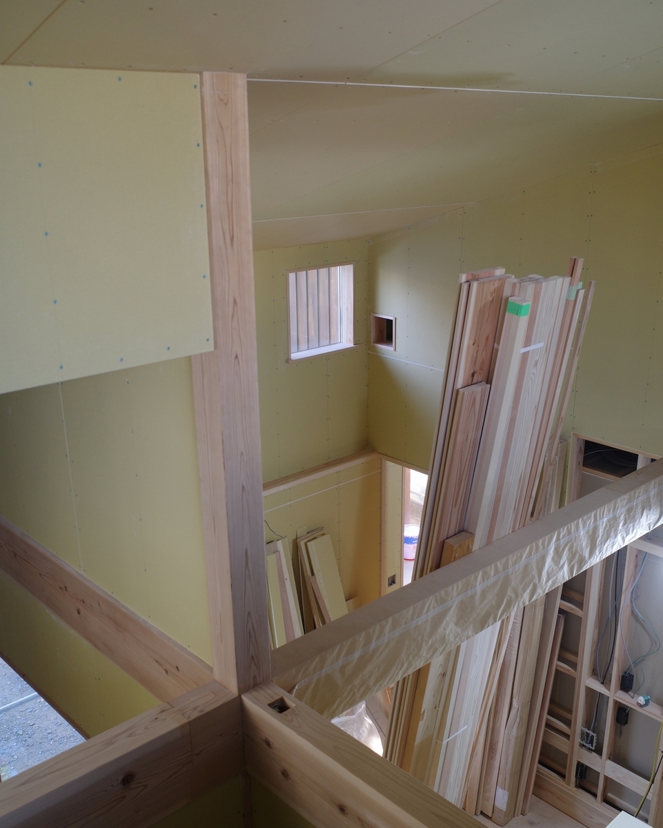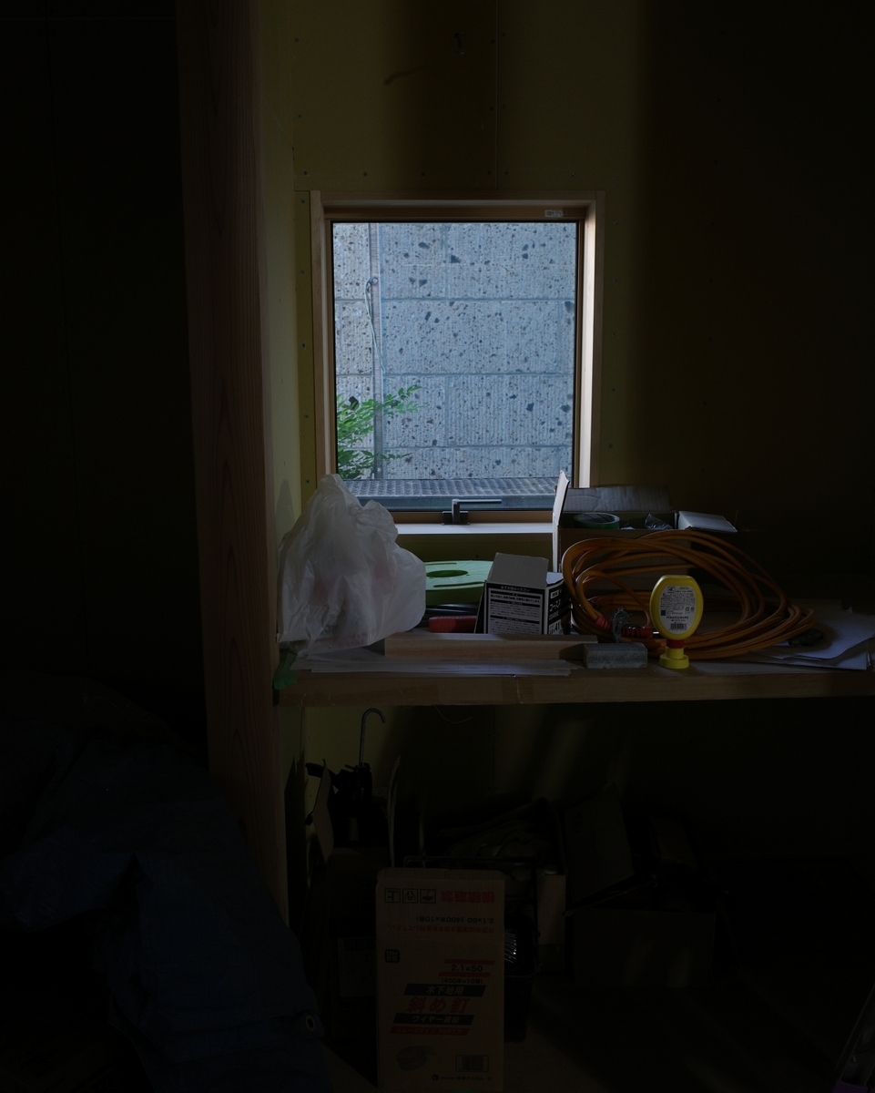 現場は雑然としていますが、下地となる石膏ボードがほぼ張り終わって部屋のカタチが見えてきました。写真はGRⅢ 適宜トリミング