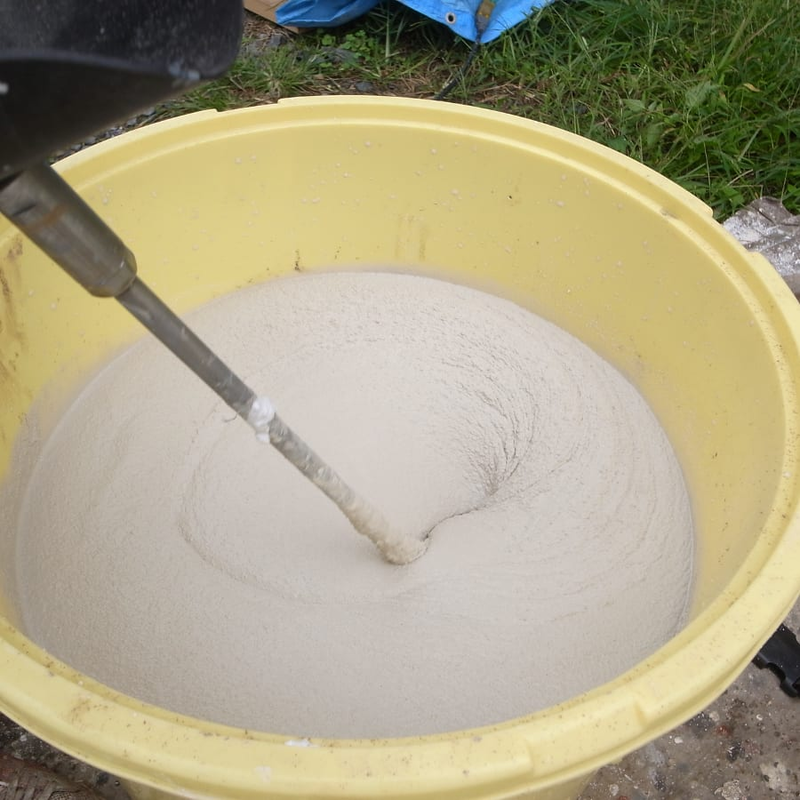 骨材を混入してミキサーでしっかりと撹拌して、骨材混入後、仕上げ吹付け状況を確認です。