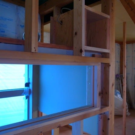 写真上は同じく2階トイレの出入口引戸の枠のディティール。建具には明り取りの額を入れずにFIX枠を組み合わせてみたら…と云う枠の納まり。