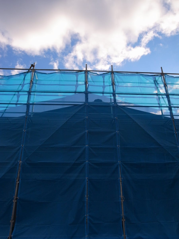 冬空からの柔らかい陽射しが、外部足場に張られた養生シートに切妻屋根の影を写しています。